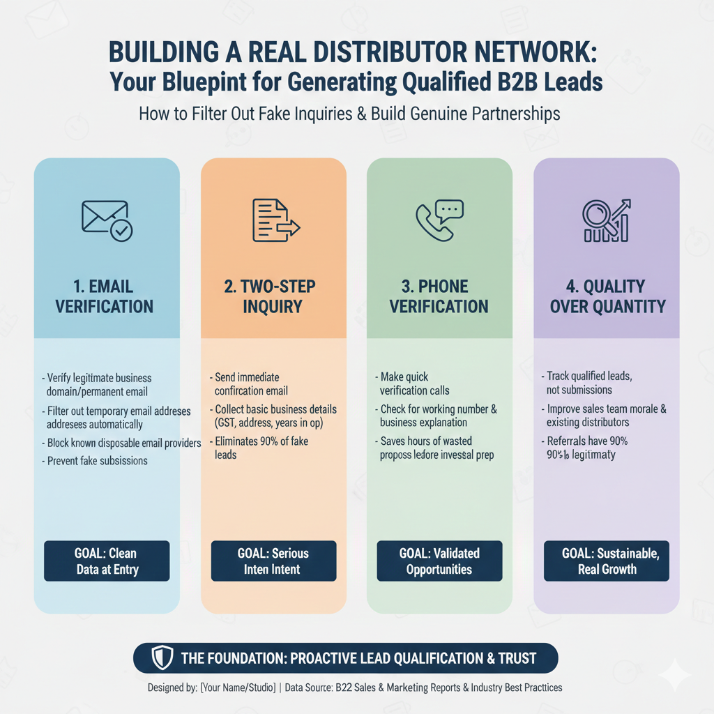 Two-Step Inquiry Process: When someone submits a distributor inquiry, send an immediate confirmation email requiring them to click a verification link and provide basic business details (GST number, business address, years in operation). This single step eliminates 90% of fake inquiries because temporary email users won’t complete verification.